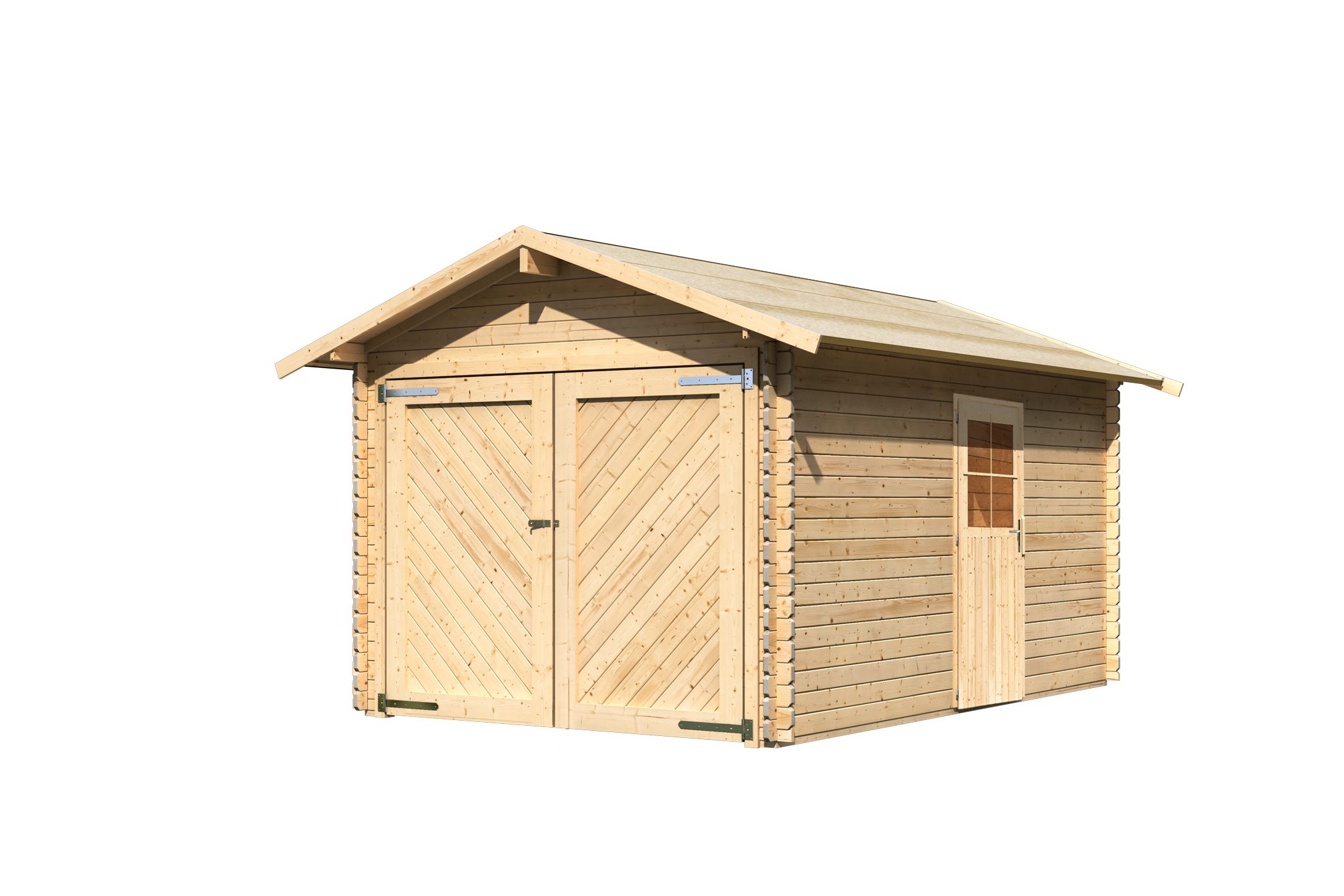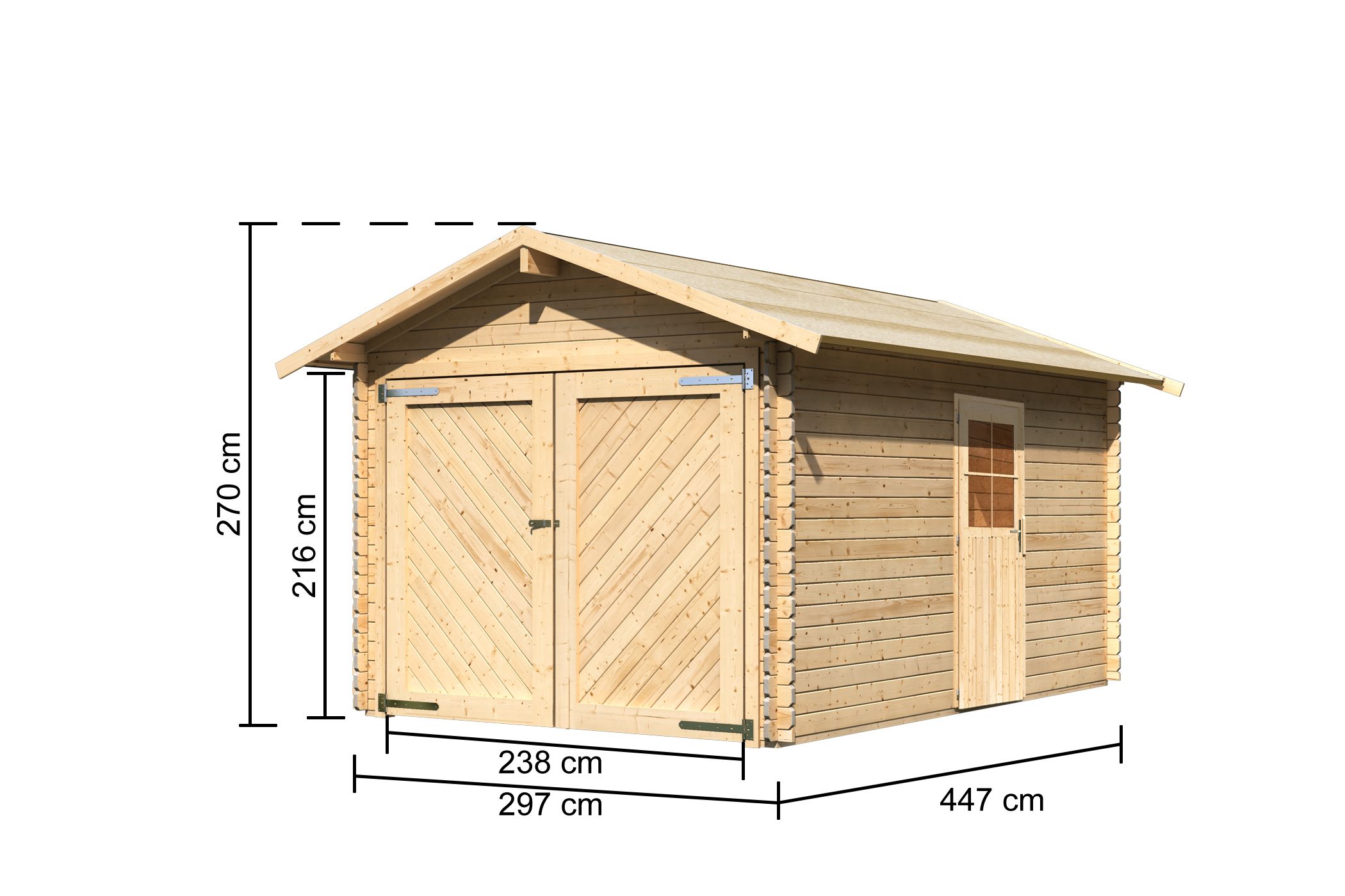 Geschützt in der Nacht und trocken am Tag. Die Blockbohlengarage mit dem klassischen Satteldach schützt Ihr Auto das ganze Jahr über. Ob im Sommer vor der Hitze oder im Winter vor dem Schnee, mit der Blockbohlengarage mit Satteldach treffen Sie garantiert die richtige Wahl. Das Satteldach besteht aus Massivholzbrettern und fügt sich, durch seine klassische Optik, in jede Umgebung ein. Durch eine seitlich montierte, klassische Einflügeltür mit einem Lichtausschnitt und einem Zylinderschloss mit drei Schlüsseln gelangen Sie zu Ihrem Auto. Der Weg mit Auto aus der Garage hinaus führt durch ein Vollholzgaragentor mit einem Durchfahrtsmaß von (BxT) 240 x 193 cm samt Profilbeschlägen. Verschlossen wird das Tor mithilfe einer Sicherheitsüberfalle. Gestalten Sie Ihre Garage nach den eigenen Vorstellungen. Mit unseren optional erhältlichen Dachschindeln können Sie dem Gesamtbild den letzten Schliff verleihen. Das naturbelassene, nordische Fichtenholz lässt sich ganz einfach durch einen Anstrich in der Lieblingsfarbe an seine Umgebung oder Ihre Wünsche anpassen. Die Garage wird in der klassischen Blockbohlenbauweise mit der patentierten 6-Plus-Eckverbindung montiert. Mit einem Außenmaß von 297 x 447 cm besitzt sie die ideale Größe und ist bestimmt passend für Ihr Auto. Schützen Sie Ihr Eigentum mit der Blockbohlengarage mit Satteldach und verleihen Sie Ihrem Garten den letzten Schliff.