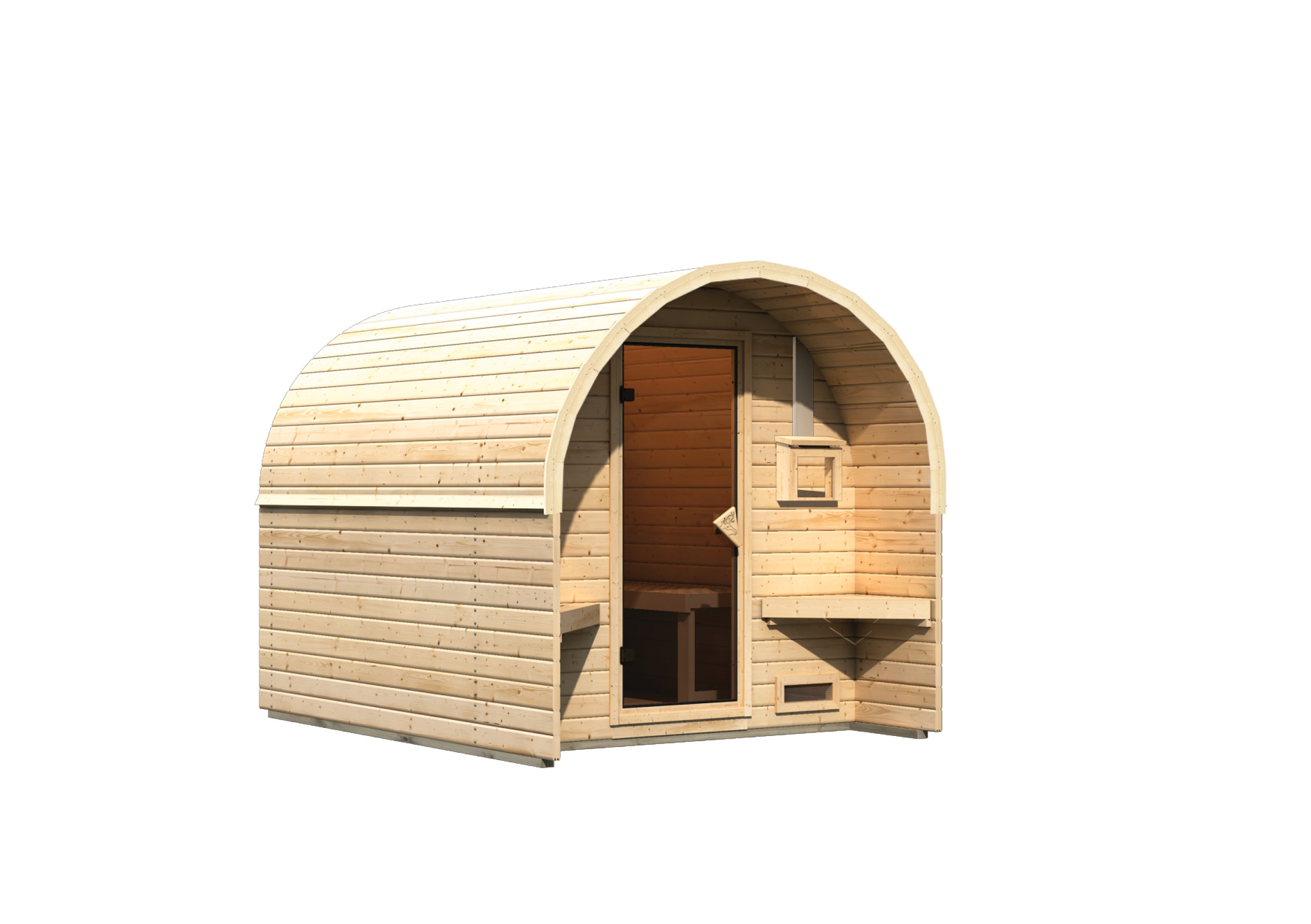 Das Fasshaus aus 38 mm starker, nordischer Fichte wird im Steck-/Schraubsystem montiert. Mit einem Gesamtmaß von 205 cm x 273 cm bietet es genügend Platz zum Entspannen. Innen bieten 2 Saunabänke aus Fichte Platz zum Liegen. Das formschöne und praktische Tonnendach sorgt für den Witterungsschutz von oben. Betreten werden kann das Saunahaus durch eine bronzierte Ganzglastür mit Magnetverschluss. Ein Ofenschutzgitter und alle notwendigen Schrauben und Beschläge sowie eine aussagekräftige Montageanleitung sind selbstverständlich ebenfalls dabei.