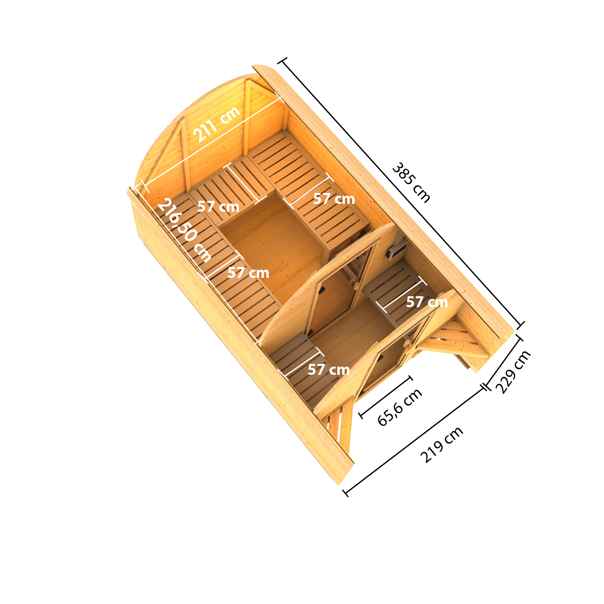 Das Fasshaus aus 38 mm starker, nordischer Fichte wird im Steck-/Schraubsystem montiert. Mit einem Gesamtmaß von 219 cm x 385 cm bietet es genügend Platz zum Entspannen. Innen bieten 3 Saunabänke aus Fichte Platz zum Liegen. Das formschöne und praktische Tonnendach sorgt für den Witterungsschutz von oben. Betreten werden kann das Saunahaus durch eine bronzierte Ganzglastür mit Magnetverschluss. Ein Ofenschutzgitter und alle notwendigen Schrauben und Beschläge sowie eine aussagekräftige Montageanleitung sind selbstverständlich ebenfalls dabei.