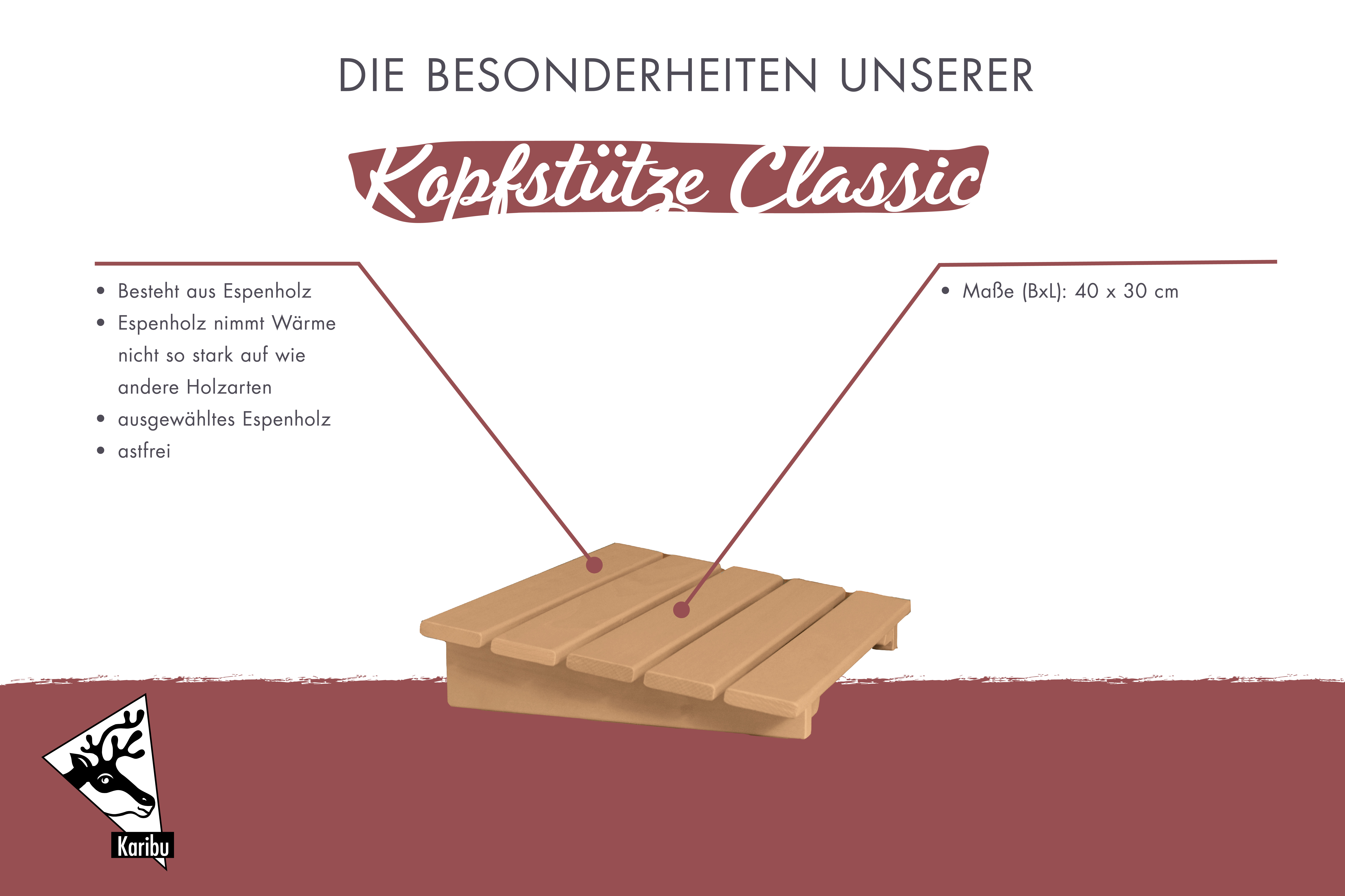 Das Saunieren im Liegen in vollen Zügen genießen. Befindet sich der Körper in unterschiedlichen Zonen, muss er die Temperaturen zwischen Kopf und den Füßen ausgleichen. Dies führt zu einer starken Belastung des Körpers. Damit der Körper während eines Saunaganges sich in einer Temperaturzone befindet und die Belastung reduziert wird, ist es ratsam die Beine ausgestreckt mit auf die Saunabank zu legen oder im Liegen zu Saunieren. Durch das Liegen verbessern Sie die Blutzirkulation und der Körper kommt schneller auf Temperatur. Damit Ihr Kopf gestützt und die Wirbelsäule entlastet wird, empfehlen wir unsere Kopfstütze Classic. Diese besteht aus weichem, massivem Espenholz und kann einfach auf die Saunaliege aufgelegt werden. Sie besitzt ein Maß von (BxL) 40x30 cm und sorgt für den nötigen Komfort in Ihrer Sauna. Da das helle, weiß-gelbliche Holz die Wärme nicht so stark aufnimmt wie andere Holzarten, eignet es sich optimal für die Innenausstattung einer Sauna. Die Kopfstütze Classic - damit Sie Ihren Saunagang in der eigenen Wellness-Oase nicht nur im Sitzen genießen können.