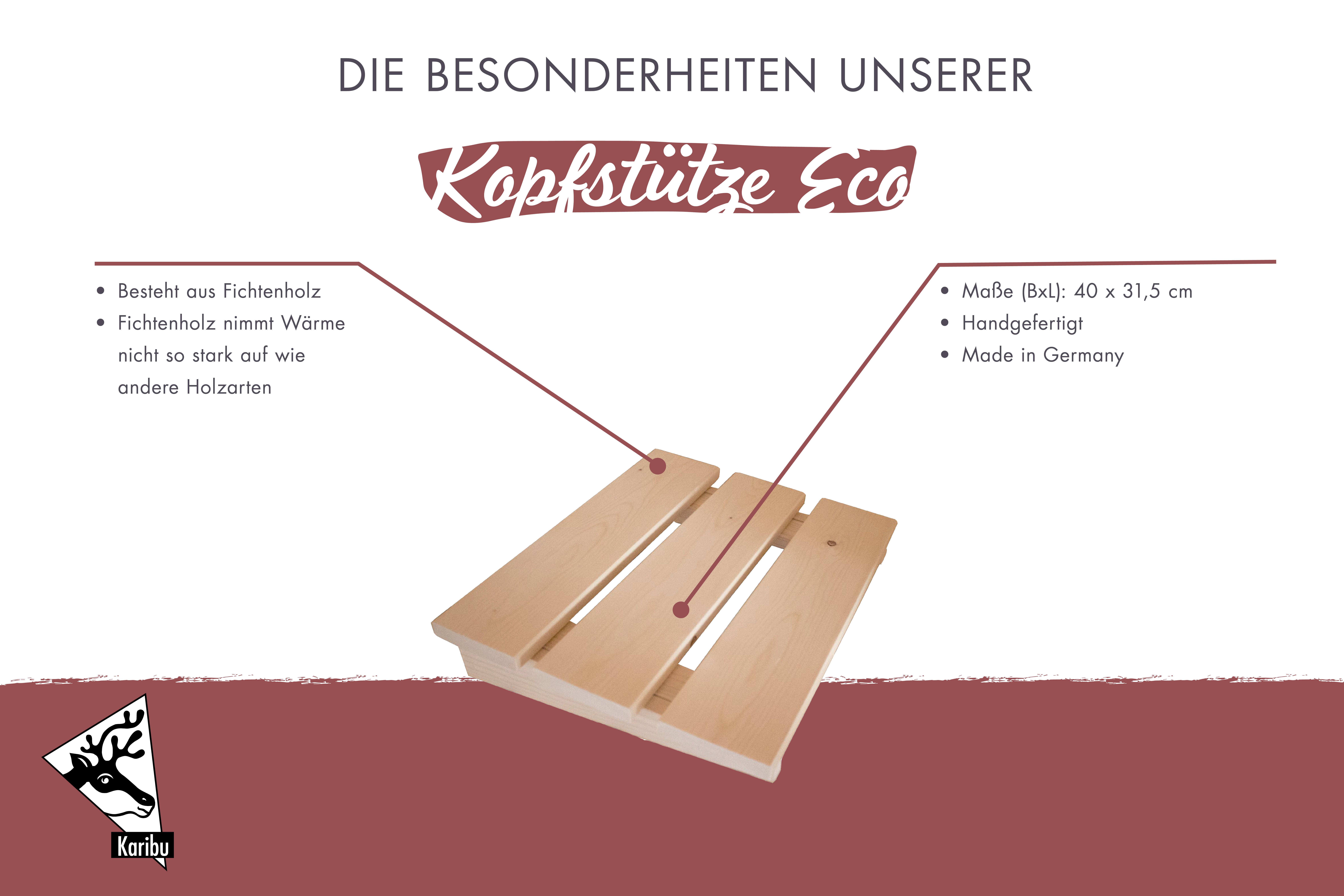Das Saunieren im Liegen in vollen Zügen genießen. Befindet sich der Körper in unterschiedlichen Zonen, muss er die Temperaturen zwischen Kopf und den Füßen ausgleichen. Dies führt zu einer starken Belastung des Körpers. Damit der Körper während eines Saunaganges sich in einer Temperaturzone befindet und die Belastung reduziert wird, ist es ratsam die Beine ausgestreckt mit auf die Saunabank zu legen oder im Liegen zu Saunieren. Durch das Liegen verbessern Sie die Blutzirkulation und der Körper kommt schneller auf Temperatur. Damit Ihr Kopf gestützt und die Wirbelsäule entlastet wird, empfehlen wir unsere Kopfstütze Eco. Diese besteht aus Fichtenholz und kann einfach auf die Saunaliege aufgelegt werden. Sie besitzt ein Maß von (BxL) 40x31,5 cm und sorgt für den nötigen Komfort in Ihrer Sauna. Da das helle, weiß-gelbliche Holz die Wärme nicht so stark aufnimmt wie andere Holzarten, eignet es sich optimal für die Innenausstattung einer Sauna. Die Kopfstütze Eco - damit Sie Ihren Saunagang in der eigenen Wellness-Oase nicht nur im Sitzen genießen können.