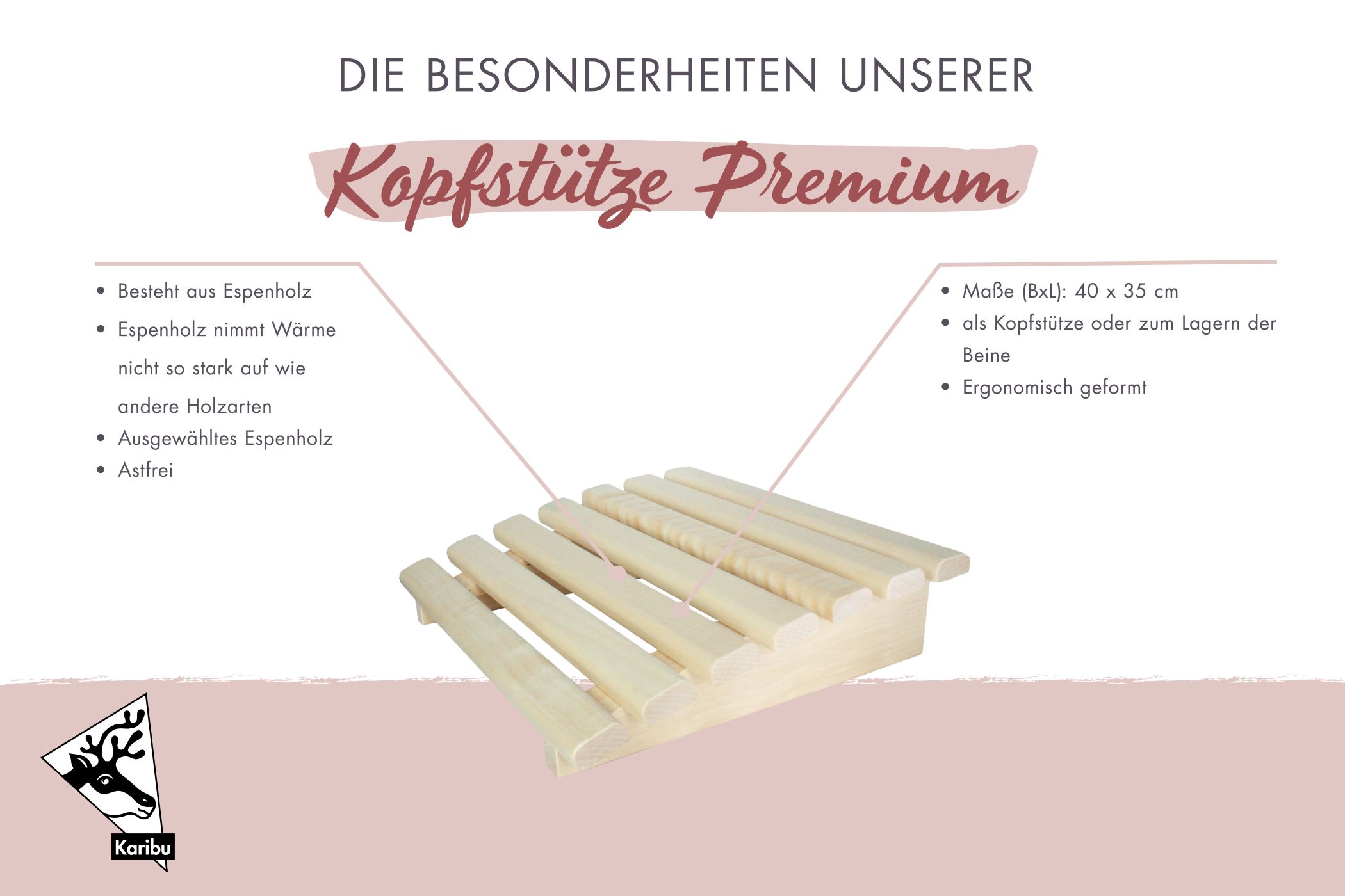 Entspannt liegen während des Saunierens und dabei nicht nur den Kopf, sondern auch die Beine bestmöglich stützen? Mit der Kopfstütze Premium ist dies kein Problem. Die Kopfstütze besteht aus hochwertigem Espenholz. Sie besitzt eine abgerundete Form und kann so für ein angenehmes Liegegefühl sorgen. Die Kopfstütze hat ein Maß von (BxL) 40x35 cm. Für den perfekten Liegekomfort empfehlen wir das 3er Set. Einsatzzweck der Kopfstütze Premium Eine Kopfstütze dient als Stütze für den Kopf, während weitere Kopfstützen zusammenstellen und als Unterstützung unter die Beine gelegt werden. Dadurch erhalten Sie die eine optimale Haltung beim Liegen. So unterstützen Sie nicht nur die Durchblutung in Ihrem Körper, sondern sorgen auch noch für eine gesunde Liegeposition der Wirbelsäule. Durch das weiche, weiß-gelbliche Espenholz erhält die Kopfstütze einen hochwertigen Look und rundet die Inneneinrichtung Ihrer Sauna ab. Schaffen Sie sich die optimale Liegeposition in Ihrer Sauna mit der hochwertigen Kopfstütze Premium.