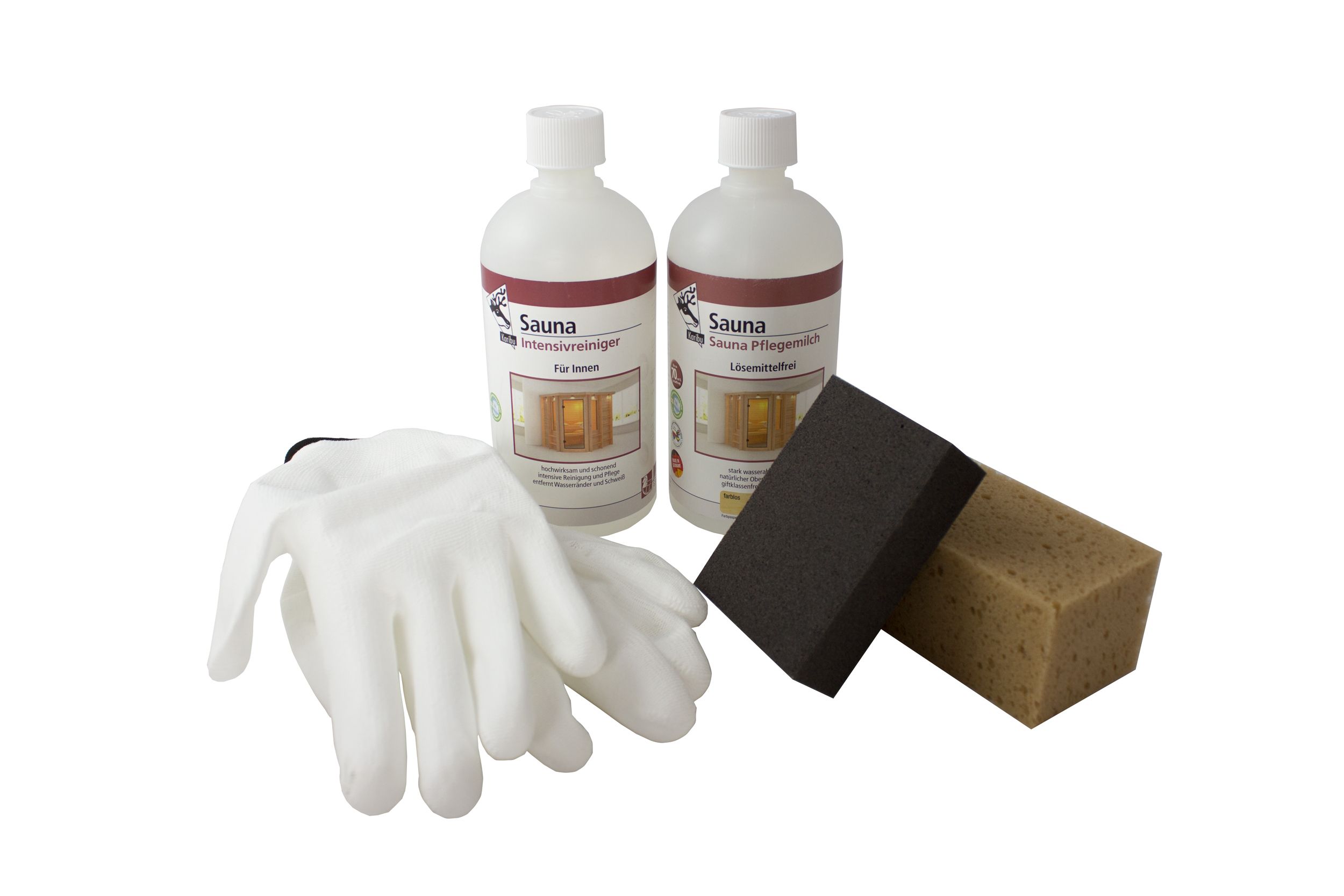 Damit Ihre Sauna zu Hause auch über Jahre hinweg schön und hygienisch sauber bleibt, sollten Sie ein spezielles Augenmerk auf die Pflege richten. Durch die Hitze und die Feuchtigkeit wird das Holz stark beansprucht und auch Metallteile werden in Mitleidenschaft gezogen. So könnten mit der Zeit zum Beispiel Schweißränder oder Wasserflecken entstehen. Um dies zu verhindern muss der Innenbereich regelmäßig gepflegt werden. In der Pflegebox sind alle notwendigen Utensilien enthalten, die Sie für die richtige Pflege Ihrer Sauna benötigen. Diese enthält eine Pflegemilch mit 0,5l Inhalt, einen 0,5l Intensivreiniger, einen Schwamm, einen Schleifschwamm, ein Paar Handschuhe sowie eine Pflegeanleitung. Sorgen Sie für den richtigen Schutz in Ihrer Sauna mit der Pflegebox für Saunen im Innenbereich.