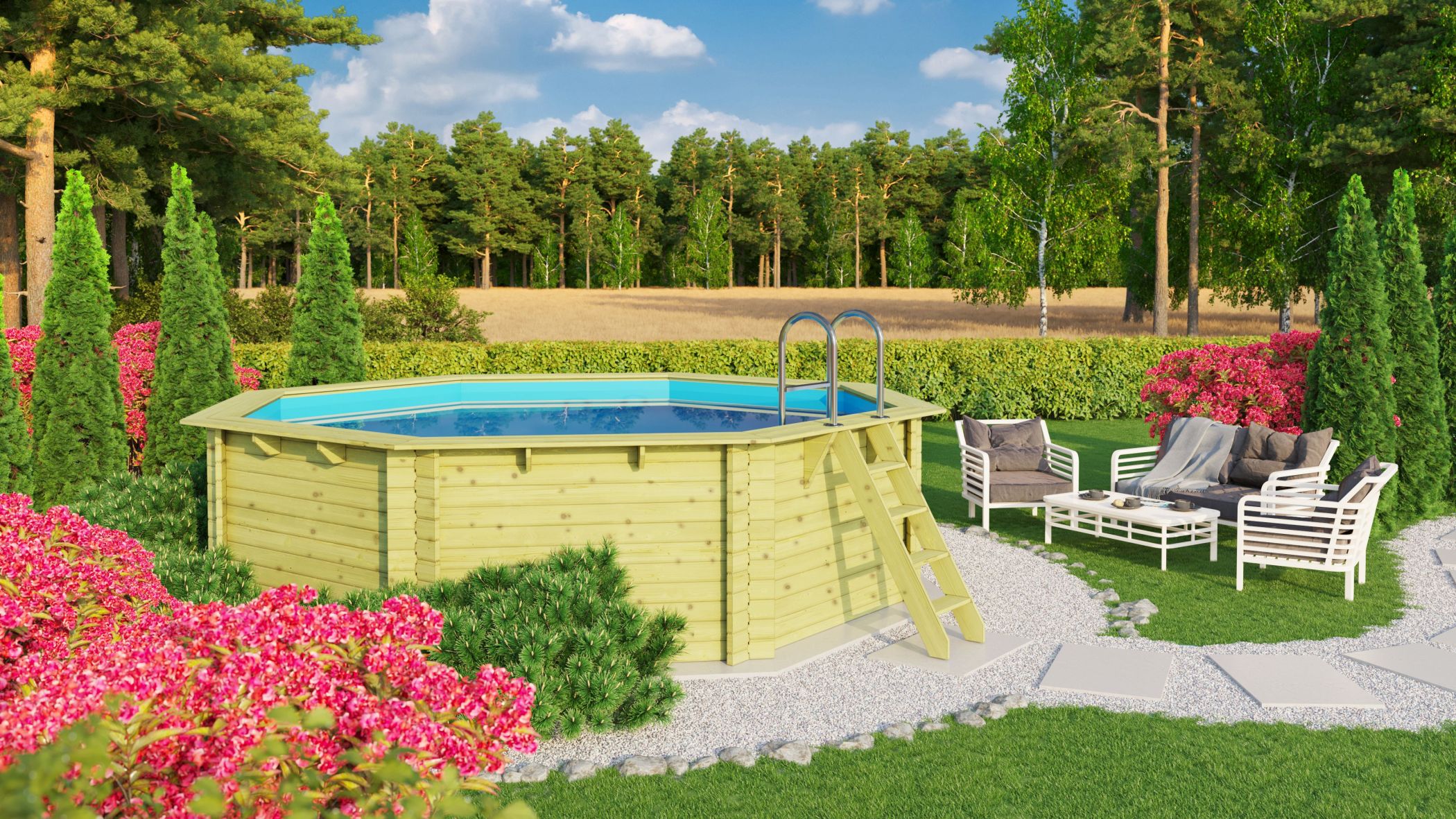 - Pool aus chromfreien kesseldruckimprägniertem Rundprofilhölzern