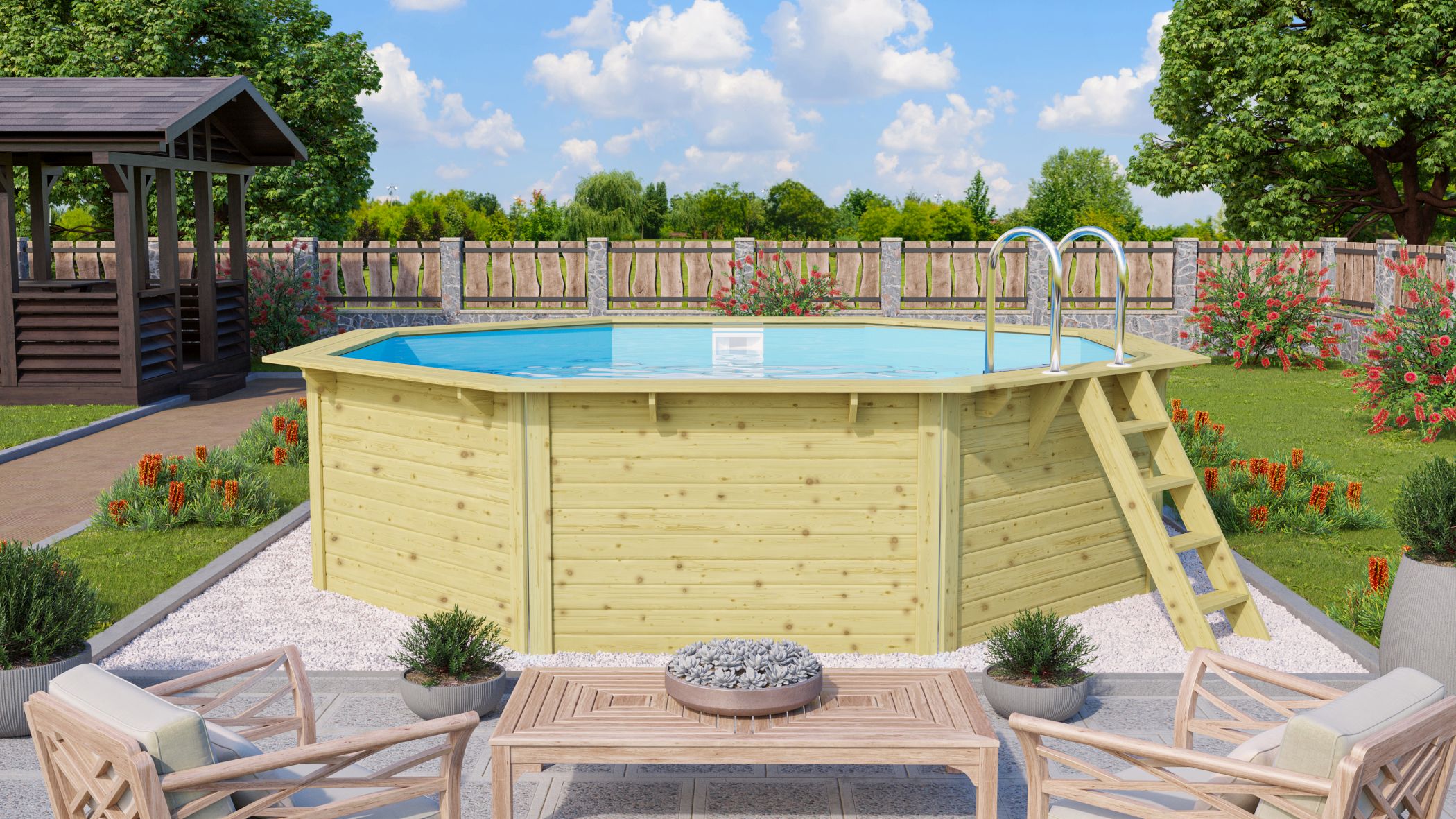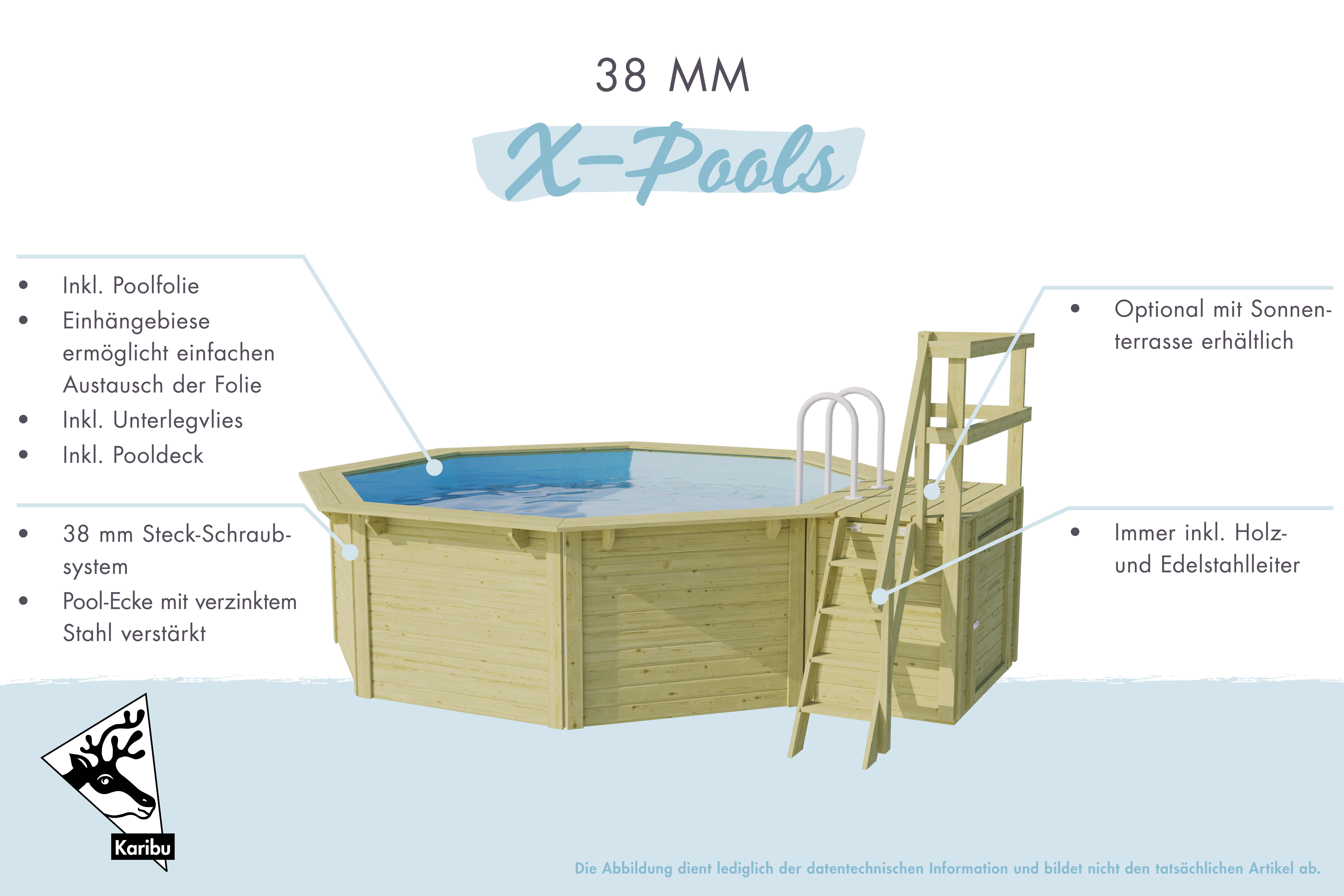 Unser Pool X ist in drei verschiedenen Größen erhältlich. Der Pool selber ist in Kesseldruckimprägniertem Fichtenholz erhältlich. Somit haben Sie die Wahl Ihren Sommerbegleiter individuell zu gestalten.