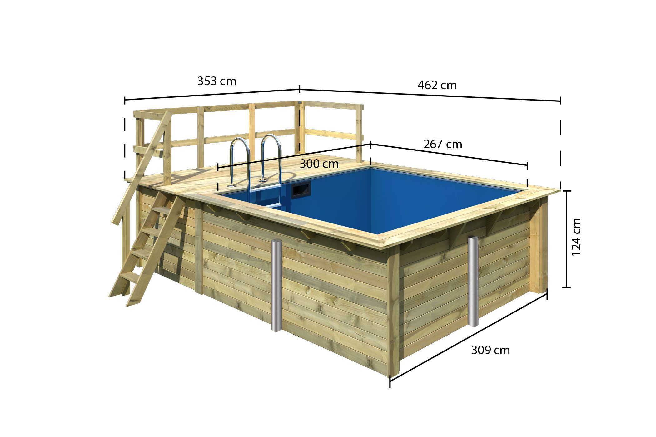 Sommer, Spaß und Entspannung! Mit dem richtigen Pool wird der Garten zum Erholungsort und Spaßbad in einem. Das Beste an unseren Rechteckpools: Durch die spezielle Kesseldruckimprägnierung Klasse 4 kann dieser Pool in den Boden eingesetzt werden. Der Rechteckpool 1 hat ein Außenmaß von 350 x 320 cm. Mit einer Füllmenge von 9772 Liter ist jede Menge Badespaß vorgesehen. Erweitern Sie Ihren Pool optional mit 2 möglichen Terrassen und erschaffen sich einen Sonnenplatz. Beobachten Sie Ihre Kleinen beim Plantschen, während Sie auf einem Liegestuhl auf der Terrasse die Sonne genießen. Der Pool besteht aus 44 mm starken, kesseldruckimprägnierten Blockbohlen, welche im klassischen Steck- und Schraubsystem montiert werden. Im Inneren sorgt eine 0,6 mm starke PVC-Folie für den Wassererhalt und ein angenehmes Gefühl unter Ihren Füßen. Bei einer max. Wasserhöhe von 111 cm können Sie sich beim lockeren Schwimmen entspannen und haben bei Bedarf dennoch einen sicheren Stand. Liegt der nächste Urlaub noch in weiter Ferne schaffen Sie sich mit dem Rechteckpool im Garten Ihr eigenes kleines Urlaubsfeeling. Ein bisschen Sand um den Pool geschüttet, ein paar Palmen aufgestellt und schon haben Sie Ihren eigenen kleinen privaten Strand. Einen Drink aus einer Kokosnuss und eine Blumenkette um den Hals und schon können Sie sich auf Ihrem Liegestuhl in die Südsee träumen. Wenn es dann zu warm wird, tauchen Sie in das kühle Wasser ein. Erweitern Sie Ihre Möglichkeiten im eigenen Garten und holen Sie sich ein bisschen Urlaubsfeeling nach Hause mit dem Rechteckpool 1.