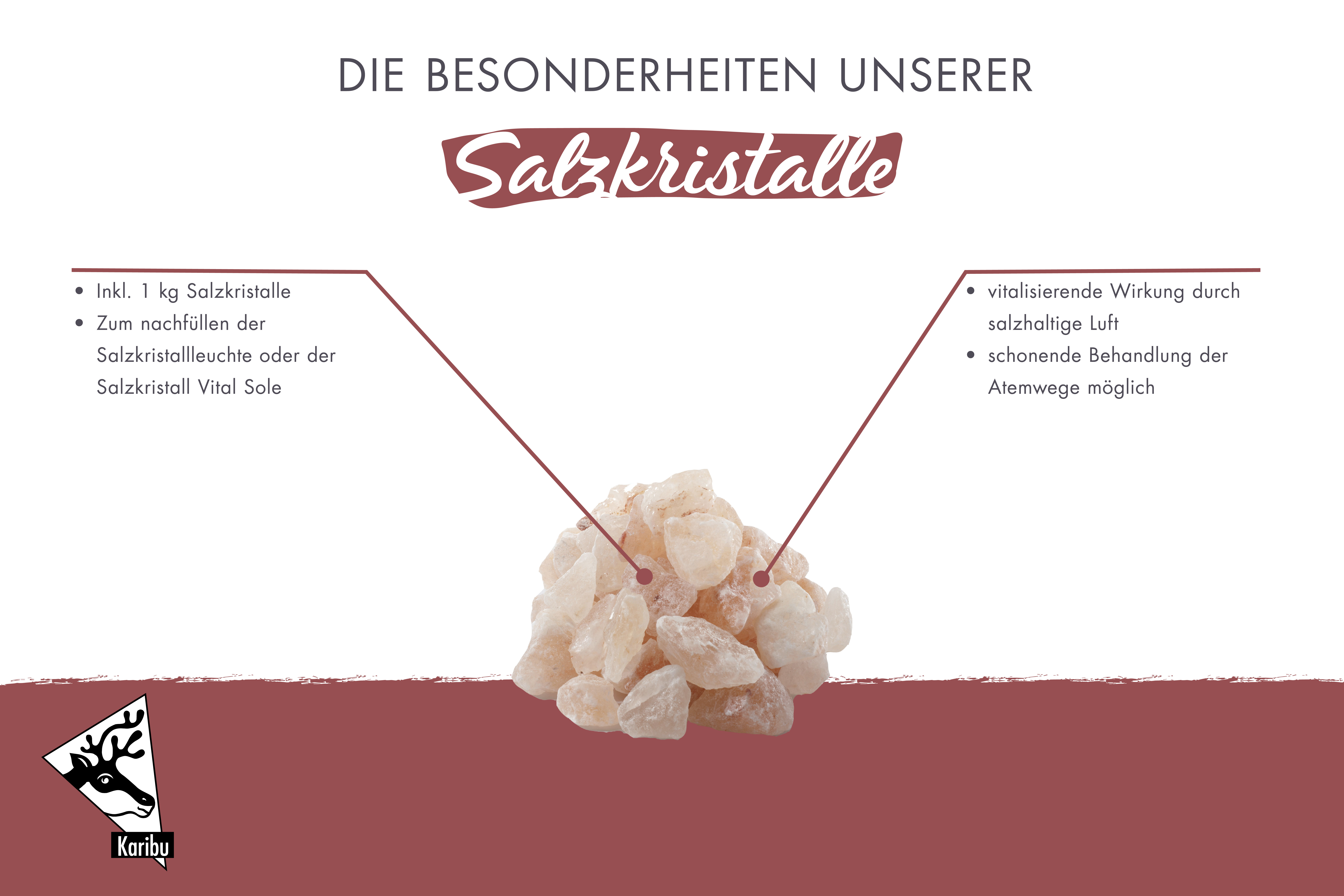 Füllen Sie Ihre Salzkristall-Leuchte oder die Salzkristall Vital Sole mit neuen Salzkristallen. Salz wird oft auch als das weiße Gold bezeichnet. Doch dieser Begriff kommt nicht von ungefähr. Schon früher hatte Salz für die Menschen eine besondere Bedeutung. Es wurde vor allem zum Würzen von Speisen und zum Haltbarmachen von Nahrungsmitteln verwendet. Salz galt früher als so wertvoll, dass es sogar als Zahlungsmittel eingesetzt wurde. Doch auch für den menschlichen Körper ist Salz von großer Bedeutung. So kontrolliert das Salz in unserem Körper zum Beispiel den Wasserhaushalt, unterstützt den Knochenaufbau und aktiviert Stoffwechselvorgänge. Ein hoher Salzgehalt in der Luft, wie dies zum Beispiel am Meer der Fall ist, sorgt für einen Reizfaktor in unseren Atemwegen. Durch den Reiz löst sich Schleim aus den Atemwegen und Sie können wieder tief ein- und ausatmen. So hat es eine schonende Wirkung auf die Atemwege, verbessert Ihr Wohlbefinden, beugt Entzündungen vor und sorgt für einen ausgeglichenen ph-Wert der Haut. Vor allem Allergiker und Asthmatiker profitieren von den zahlreichen Eigenschaften. Holen Sie sich die positiven Wirkungen des weißen Golds nach Haus in Ihre Sauna. Mit den Salzkristallen können Sie die Kristalle in Ihrer Salzkristall-Leuchte oder die Salzkristall Vital Sole erneuern und sorgen so für eine angenehm frische Luft in Ihrer Sauna.