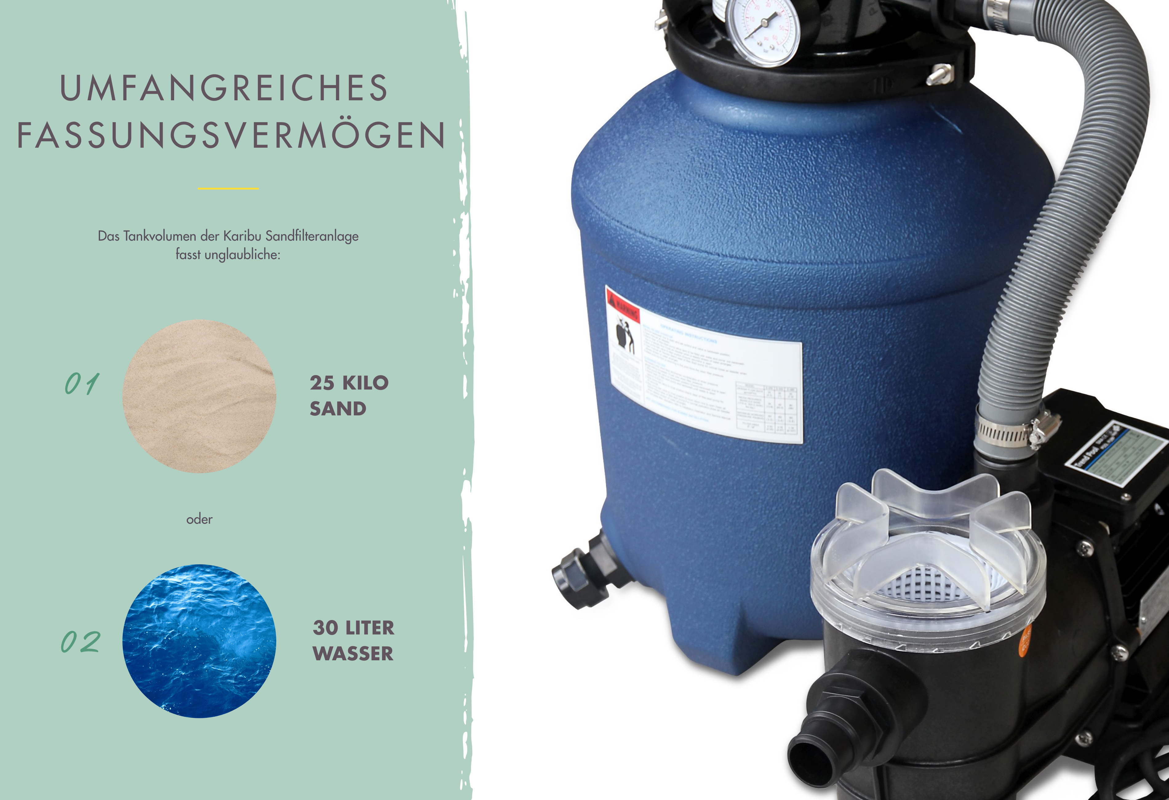 Um lange Freude an Ihrem Karibu-Pool zu haben ist die Pflege und Reinigung des Pools aber auch des Wassers äußerst wichtig. Mit unserer Filteranlage groß können Sie die Reinigung des Wassers jederzeit gewährleisten. Die Sandfilteranlage setzt sich aus einem Filterkessel, einem Anschlussschlauch und einer Pumpe zusammen. Die Pumpenleistung liegt im Normalbetrieb bei 9.960 l/h und der Filterbetrieb bei 6.500 l/h. Der Quarzsand wird in den Filterkessel gefüllt und reinigt das Wasser. Er ist feuergetrocknet und hat eine Körnung von 0,4 bis 0,8mm. Das Wasser wird durch die Sandfilteranlage kontinuierlich und langsam gefiltert. Dies führt zu einer sehr hohen Wasserqualität. Die Pumpe wird über einen 230V-Anschluss angeschlossen. Halten Sie Ihren Pool sauber mit dem Filterparket.