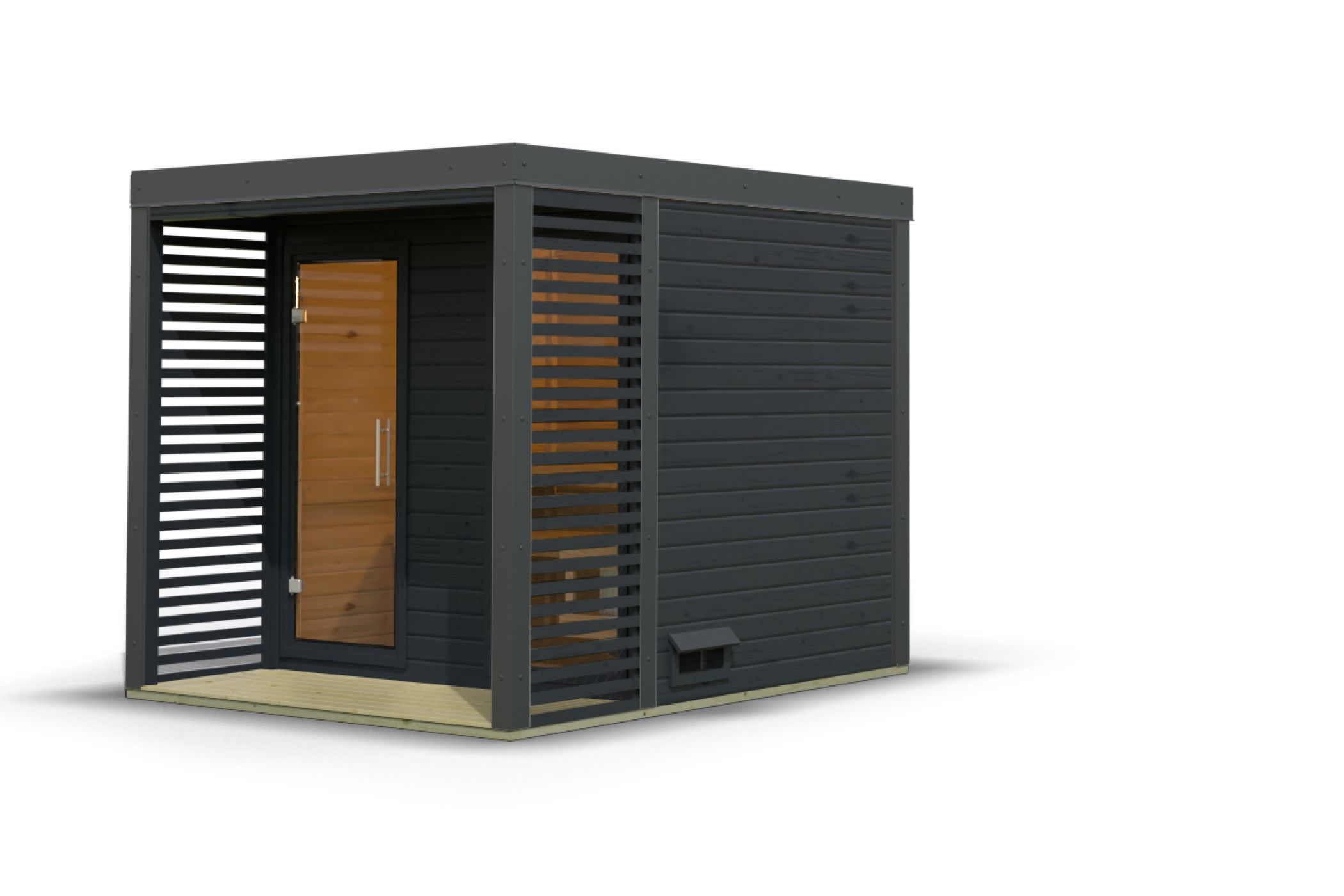 Von wegen innere Werte: auch von außen punktet unser Saunahaus mit Qualität und durchdachten Lösungen. Das hochwertige Flachdach aus Massivholz sorgt dafür, dass Sie in der Sauna auch langfristig einen kühlen Kopf bewahren können. Das Thema konstruktiver Holzschutz wird mit einem Dachüberstand ausreichend berücksichtigt. So bleiben Tür, Fenster und Wandbretter optimal geschützt. Unterhalb des Hauses sorgen unsere kesseldruckimprägnierten Bodenbalken in Verbindung mit dem mitgelieferten Massivholzboden für ausreichenden Schutz vor Staunässe oder aufsteigender Feuchtigkeit. Im Bereich der Sauna haben wir eine zusätzliche Zwischendecke eingezogen, wie Sie sie von unseren Innensaunen kennen. Eine massive Rahmenkonstruktion aus Vierkanthölzern mit einer eingearbeiteten Mineralwolldämmung sorgt dafür, dass die Hitze da bleibt, wo sie sein soll - nämlich im Saunaraum. Darüber hinaus sorgt die eingezogene Zwischendecke mit dem Softline-Profilholz für einen optisch schönen Abschluss.