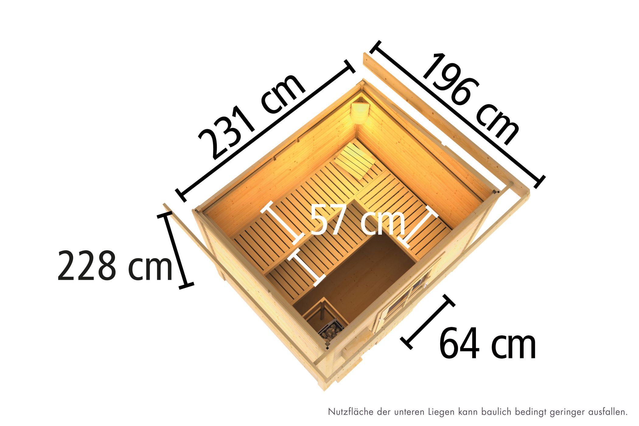 Saunieren nach dem Vorbild der Finnen. Mit dem Saunahaus Hytti 3 ist dies im eigenen Garten möglich. So ist das typische Eis- oder Schneebaden nach dem Saunagang zumindest im Winter durchaus möglich. Sollten Sie sogar einen See vor dem Haus haben, können Sie auch diesen nutzen, um sich abzukühlen. Das Saunahaus Hytti 3 bietet mit einem Außenmaß von 231 x 196 x 228 cm genügend Raum zum Entspannen. Nach einem stressigen Arbeitstag sich in den eigenen Garten zurückziehen und in der Außensauna entspannen oder den Urlaubstag im Garten mit einem ausgiebigen Saunagang abrunden