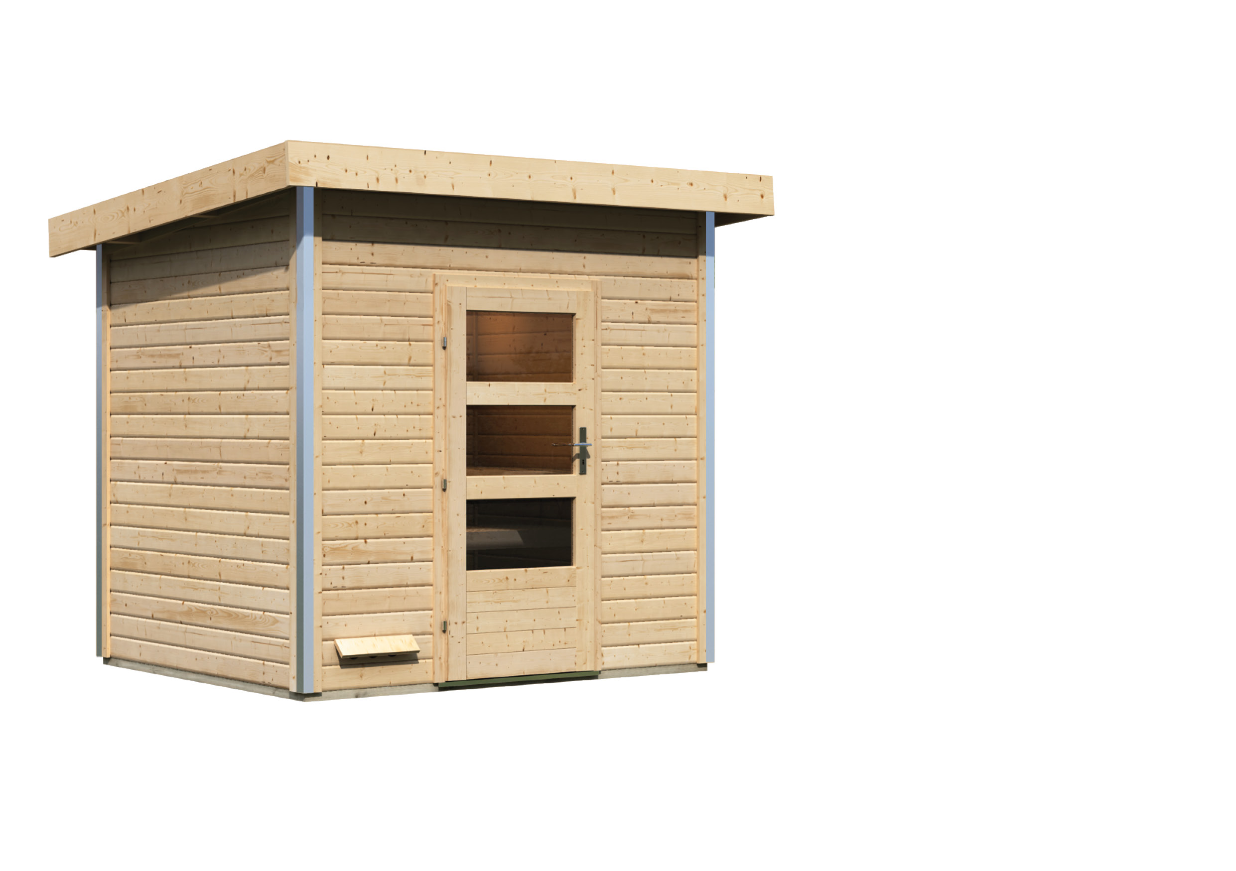 Damit die Wärme im Inneren nicht entweichen kann, wird eine zweite Decke aus einer 42mm starken Rahmenkonstruktion mit Mineraldämmwolle eingezogen. Verschlossen wird die Sauna mithilfe einer Einflügeltür mit Zylinderschloss inkl. drei Schlüsseln. Passen Sie das Saunahaus Ihrem Gartenambiente an und wählen Sie zwischen zwei Türvarianten. Die moderne Einflügeltür besitzt drei Lichtausschnitte aus Isolierglas. Diese lassen Licht in das Innere und sorgen so für eine natürliche Lichtquelle am Tag. Oder vielleicht doch lieber eine Einflügeltür mit zwei länglichen Lichtausschnitten und einem Isolierglas in Milchglasoptik für einen optisch geschlossenen Raum? Hier können Sie ganz nach Ihren Vorlieben entscheiden.