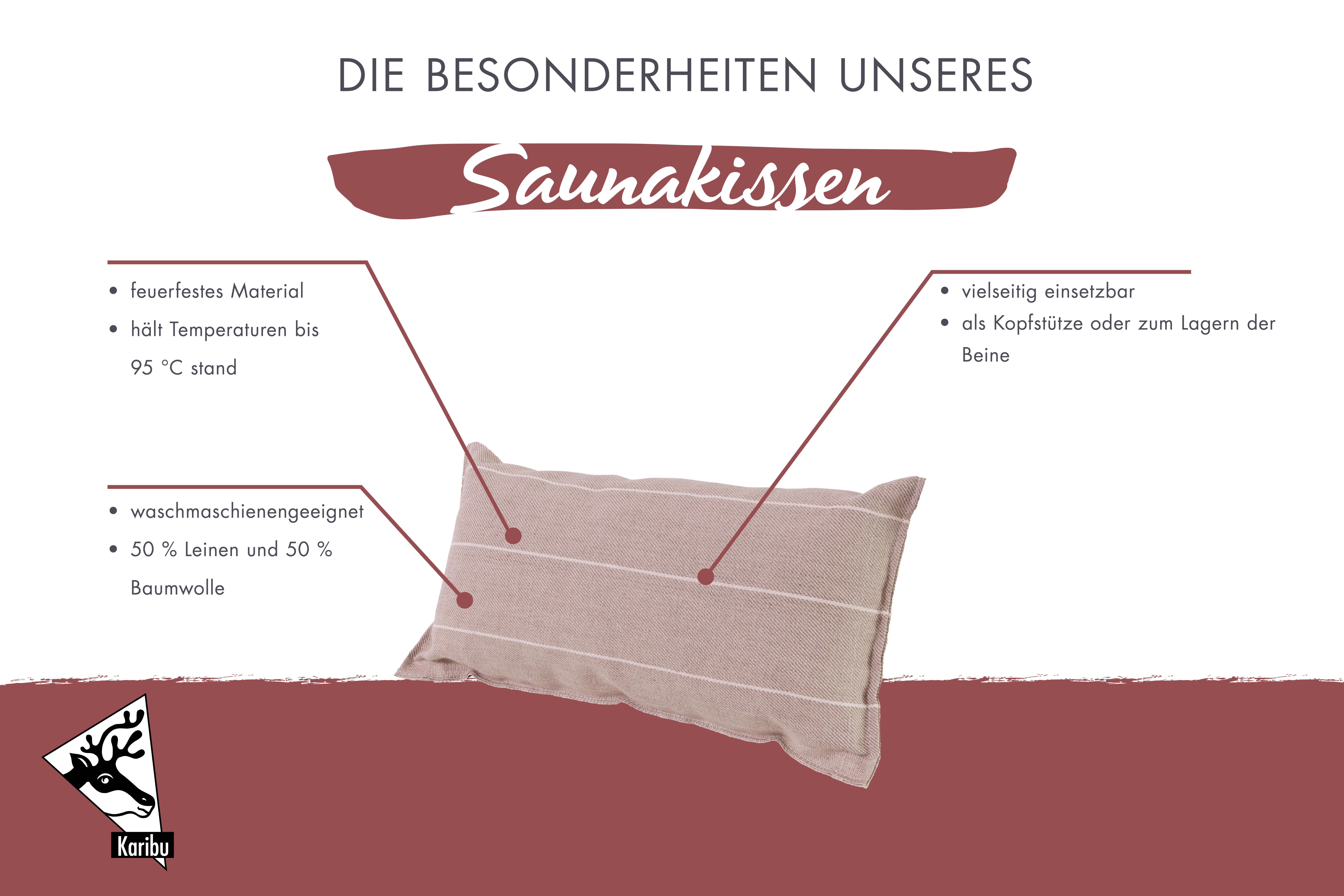Für einen extra Komfort während des Saunierens sorgt das Saunakissen. Dieses besteht aus feuerfestem und waschmaschinen-geeignetem Material. Es ist für Temperaturen bis zu 95°C geeignet. Der Bezug besteht zu 50% aus Leinen und zu 50% aus Baumwolle. Ob als Unterstützung im Rücken, als weiche Unterlage für den Kopf oder zum Hochlagern der Beine beim Liegen. Das Saunakissen kann vielseitig eingesetzt werden. Gestalten Sie sich Ihren Saunagang besonders bequem mit dem hochwertigen Saunakissen.