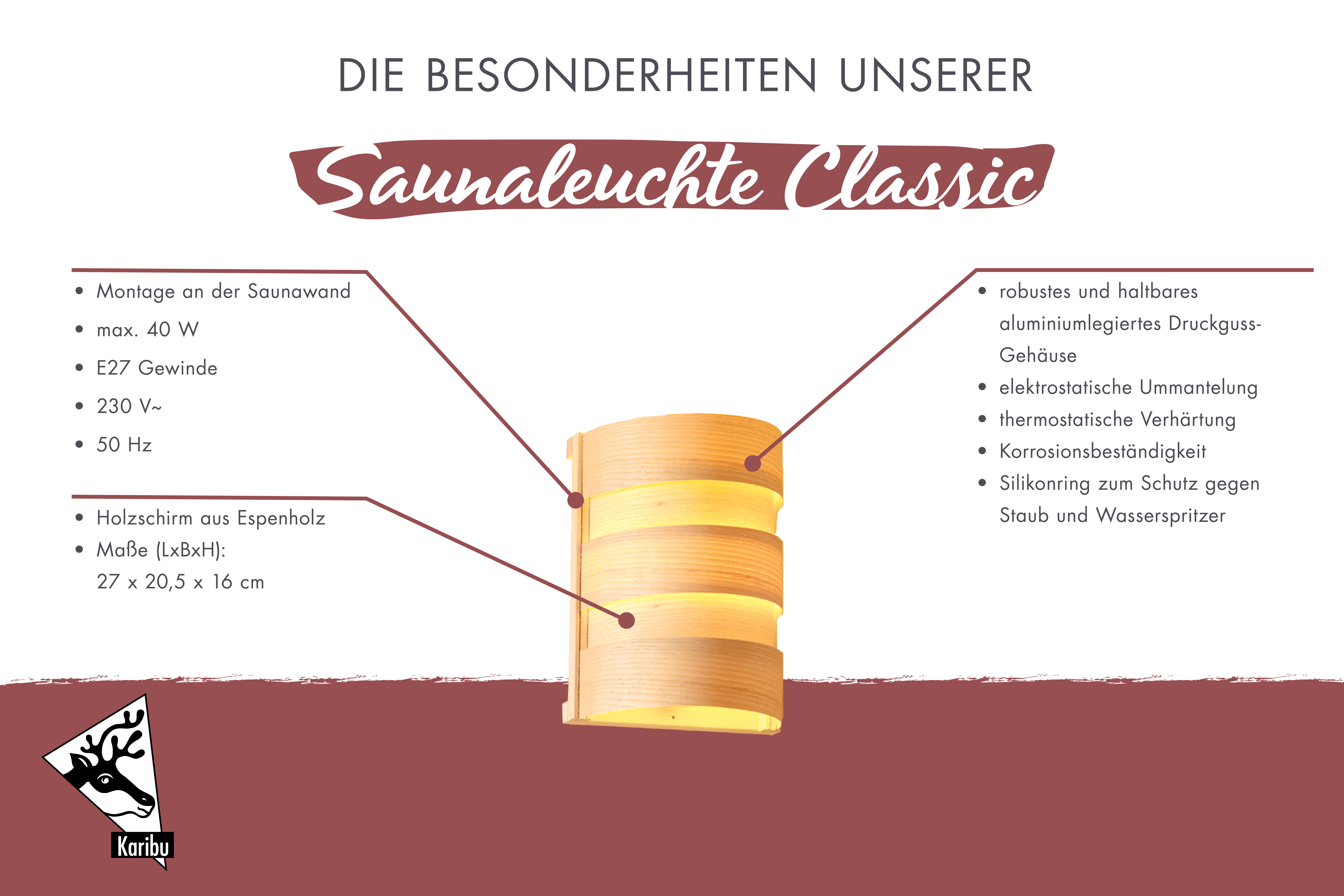 Achtung: Nur an einer geraden Wand zu montieren. Nicht im Lieferumfang ist das Anschlusskabel beim Starkstrom sowie ein Leuchtmittel. Empfohlen wird ein hitzebeständiges Saunaleuchtmittel für die E27 Fassung.