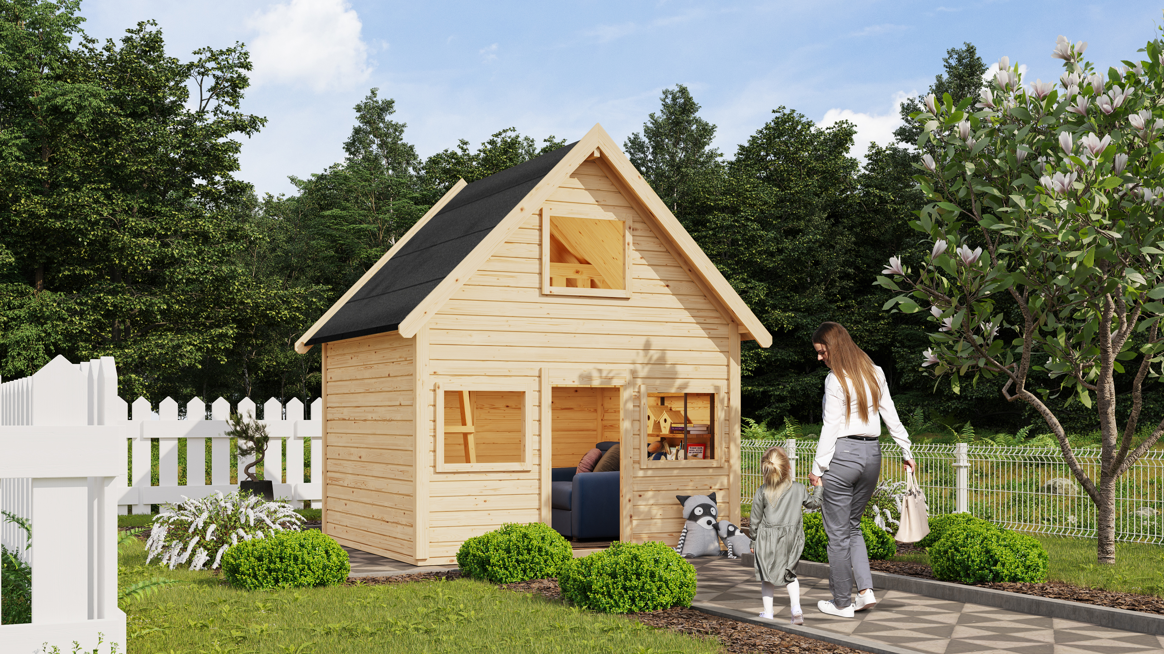 Unser qualitativ hochwertiges Spielhaus hat eine Wandstärke von 19 mm und wird auf die inklusiven KDI- (kesseldruckimprägnierten) Unterleger aufgebaut. Nordische Fichte, kommend aus dem hohen Norden Europas, ist der Rohstoff aus dem wir unser Spielhaus herstellen. Das formschöne und praktische Satteldach aus Holzplatten sorgt bei jedem Wetter für den Schutz, den Ihre Kinder brauchen. Die Seitenwand ist 141 cm hoch, bis zur Spitze des Daches gemessen sind es 253 cm. Den Zutritt verschaffen sich Ihre kleinen Großen über den Türausschnitt mit einem Maß von 47,5 cm x 97,5 cm. Die Besonderheit unseres Spielhauses Kalle besteht in der zusätzlichen Ebene, welche es Ihren Kindern ermöglicht, auf 2 Etagen zu spielen.